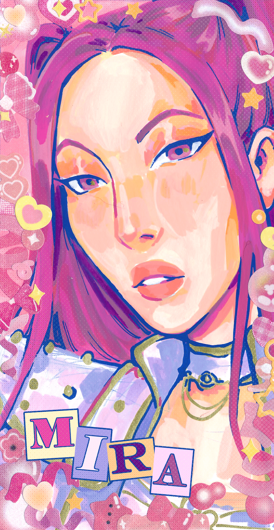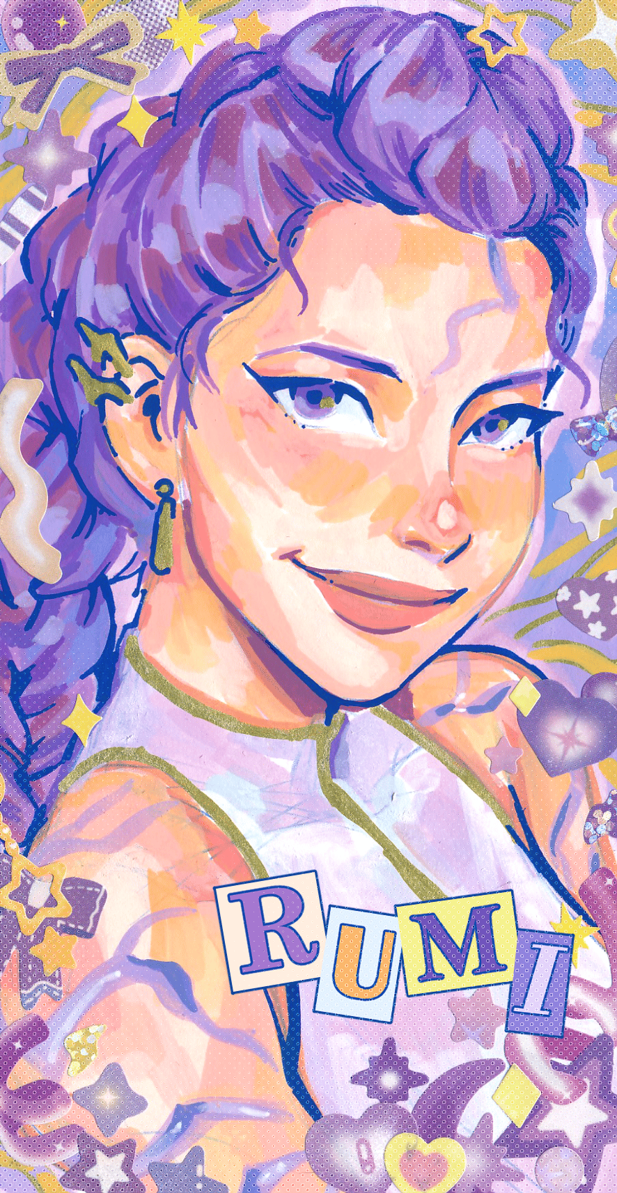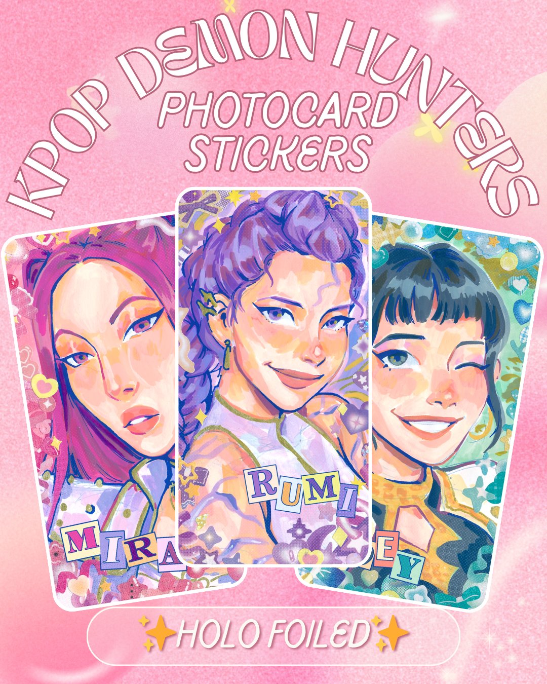 Each sticker is approximately 9cm x 4.5 cm and holo-foiled with a unique pattern to match each member of Huntrix; Stars for Rumi, Flowers for Mira and Hearts for Zoey.