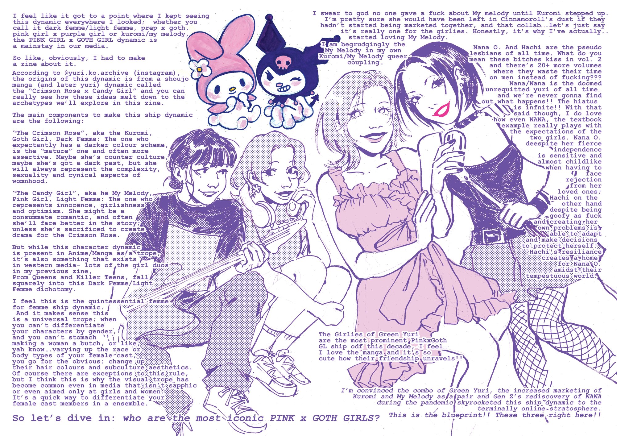 A cross between a classic fanzine and loose intersectional-feminist essay, PINK GIRL X GOTH GIRL is a zine celebrating my favourite dark / light feminine or "my melody x kuromi" pairings in media- whether they be canon or fanon!